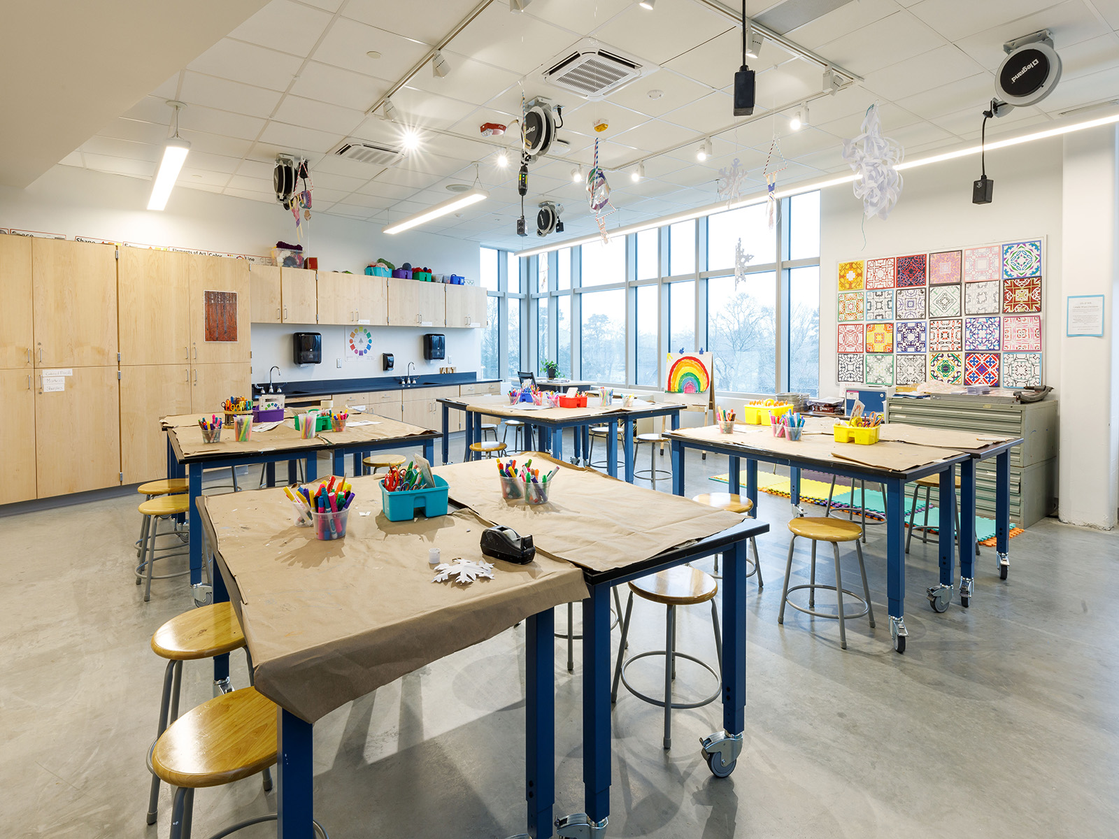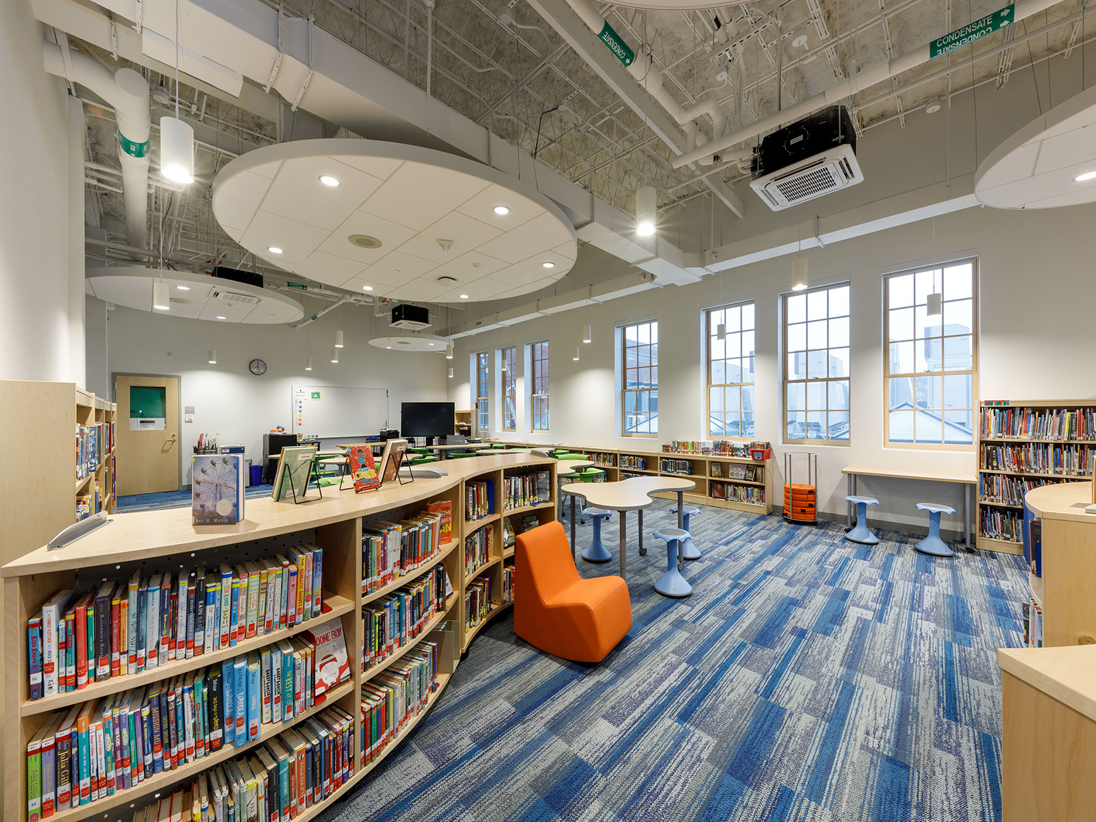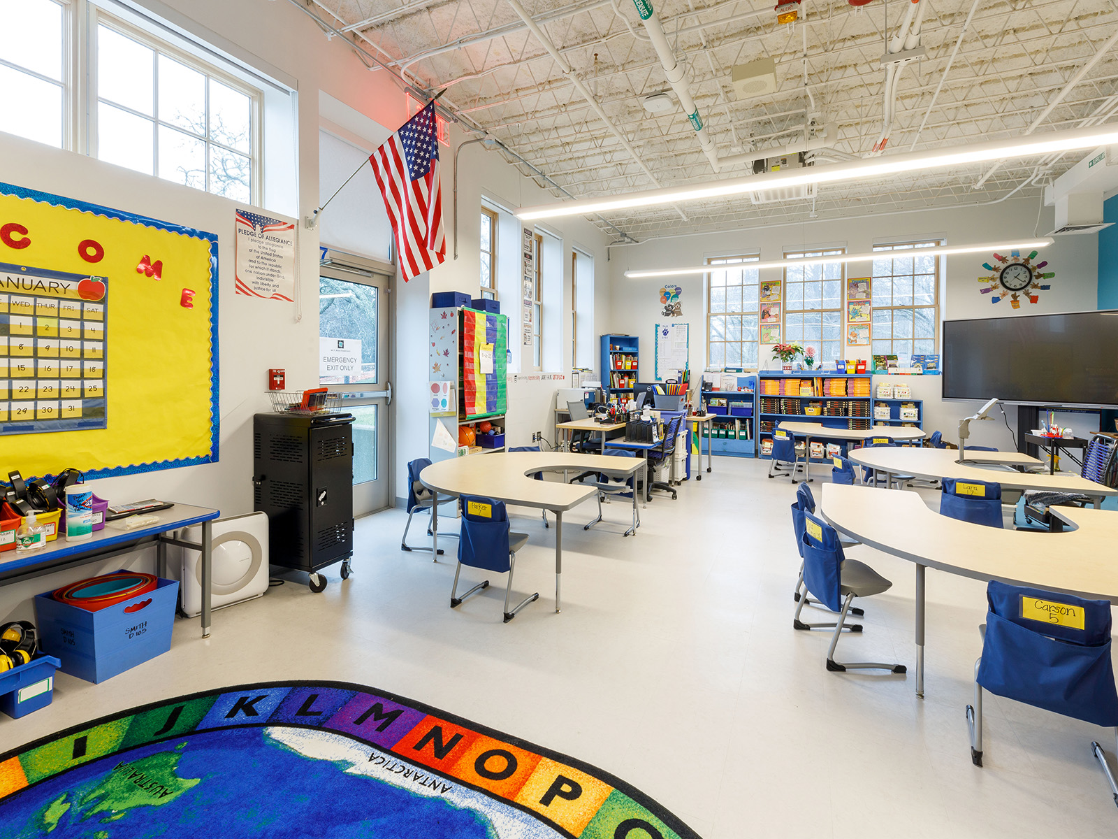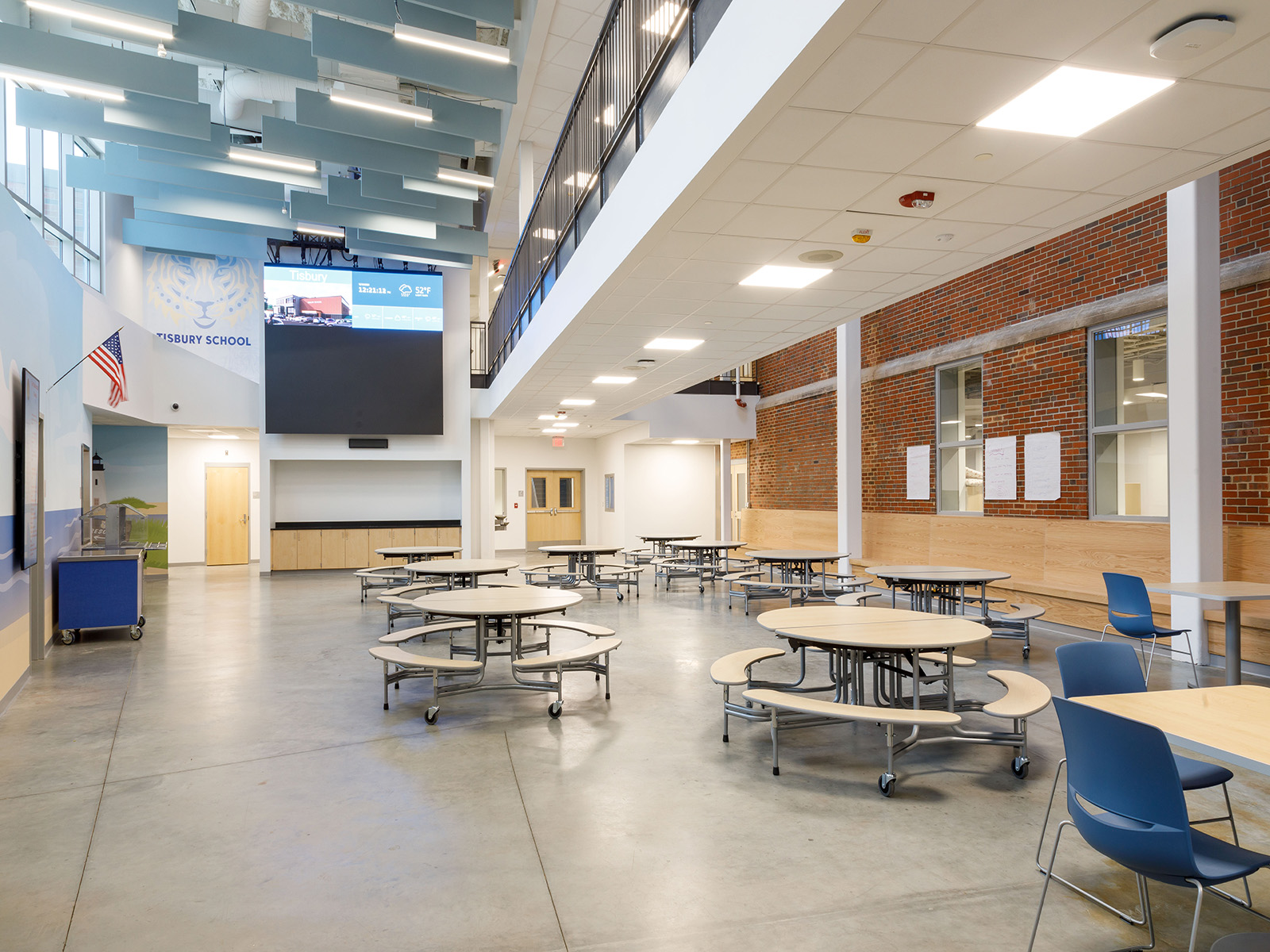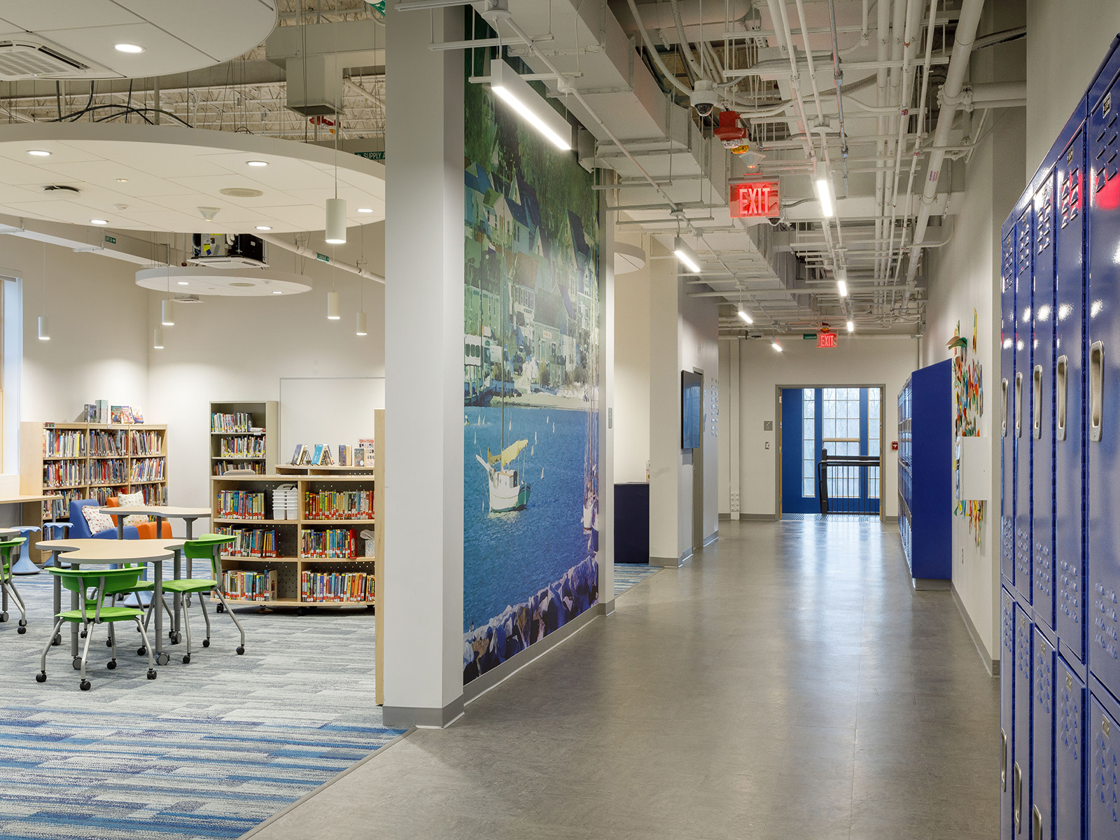 The Tisbury Elementary School project involved a comprehensive renovation of the existing 42,500 SF K-8 facility and construction of a 32,000 SF addition housing new educational spaces, a gymnasium and administrative and support spaces. The existing school was temporarily relocated to on-site modulars, allowing continuous operation throughout construction. This project featured complex phasing requirements and was designed to achieve Net Zero Ready performance.