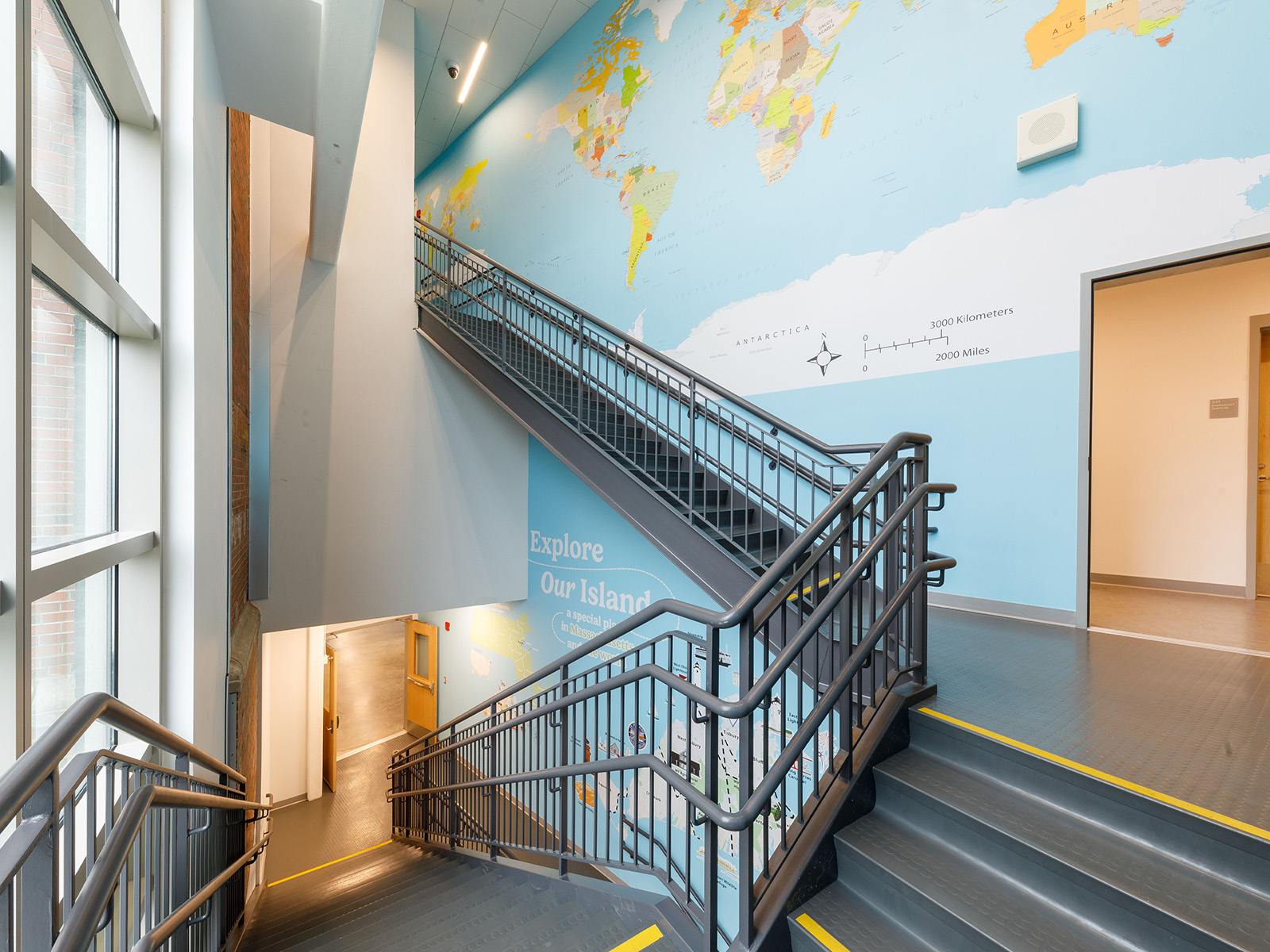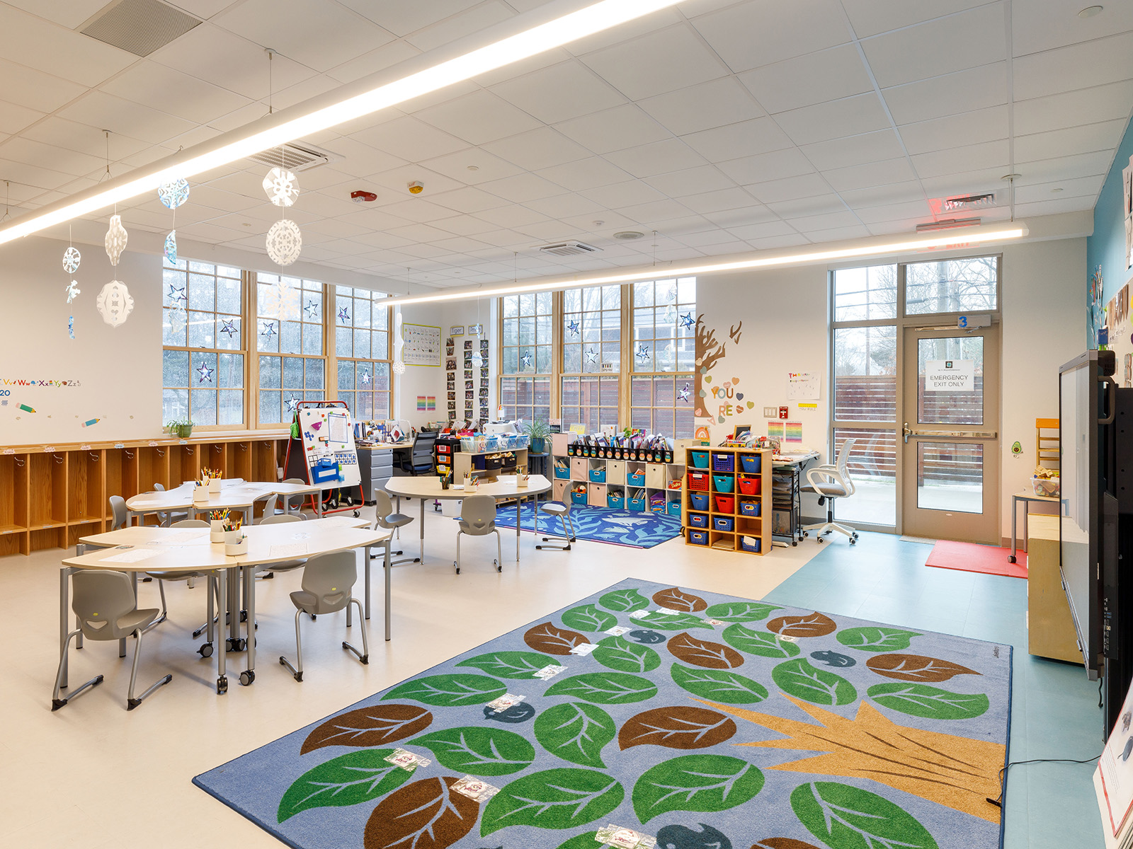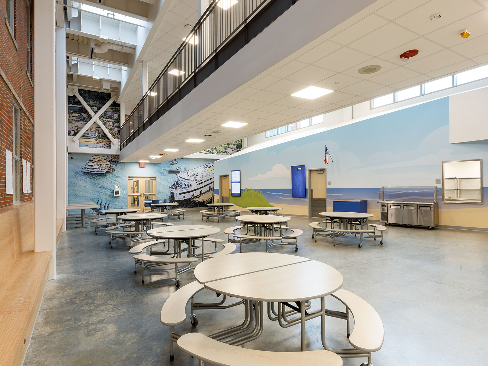 The Tisbury Elementary School project involved a comprehensive renovation of the existing 42,500 SF K-8 facility and construction of a 32,000 SF addition housing new educational spaces, a gymnasium and administrative and support spaces. The existing school was temporarily relocated to on-site modulars, allowing continuous operation throughout construction. This project featured complex phasing requirements and was designed to achieve Net Zero Ready performance.