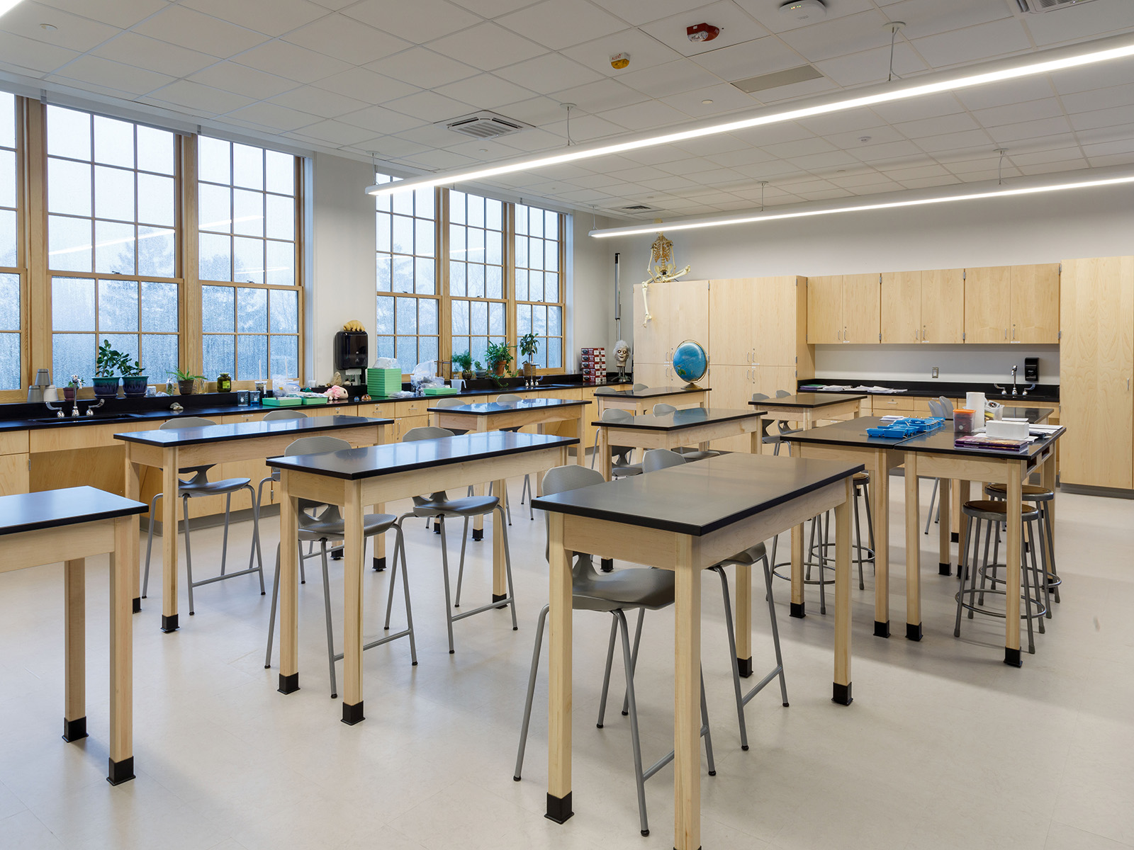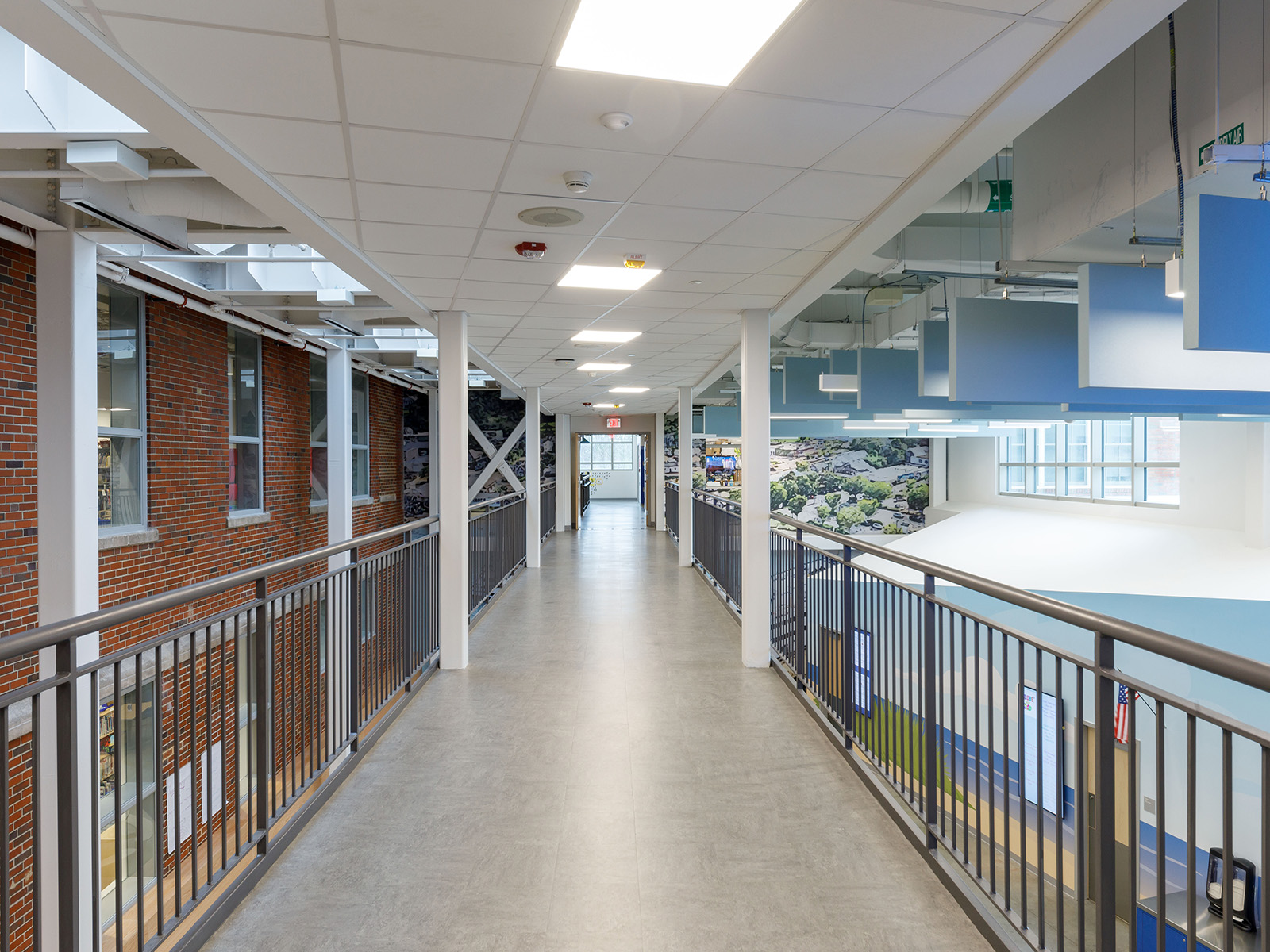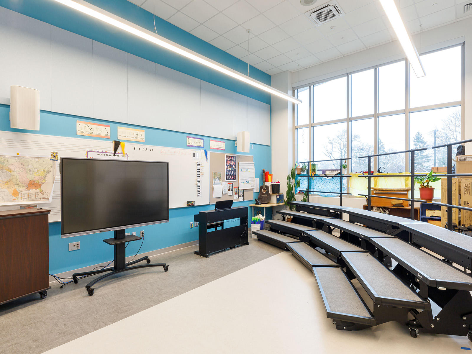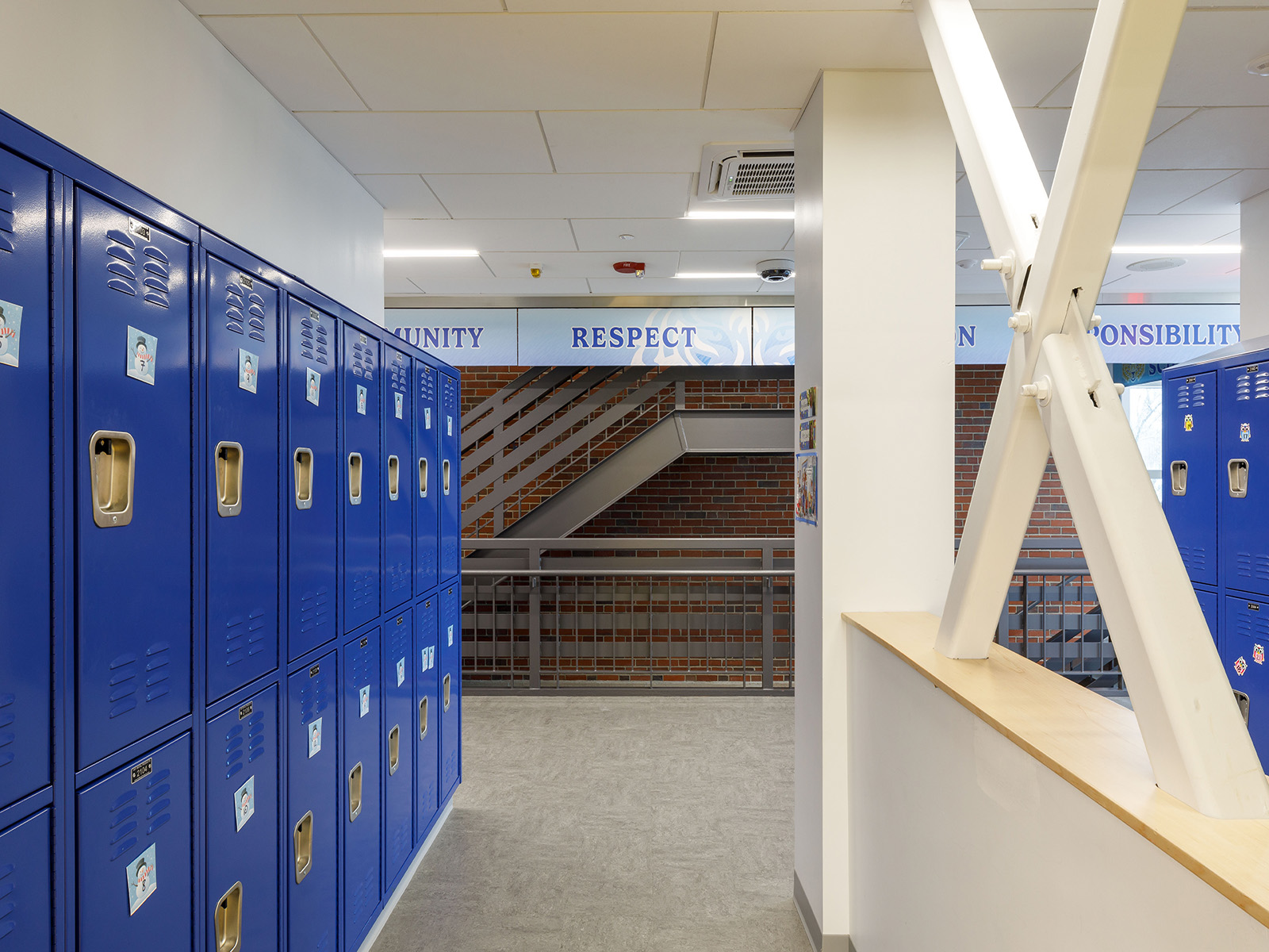 The Tisbury Elementary School project involved a comprehensive renovation of the existing 42,500 SF K-8 facility and construction of a 32,000 SF addition housing new educational spaces, a gymnasium and administrative and support spaces. The existing school was temporarily relocated to on-site modulars, allowing continuous operation throughout construction. This project featured complex phasing requirements and was designed to achieve Net Zero Ready performance.